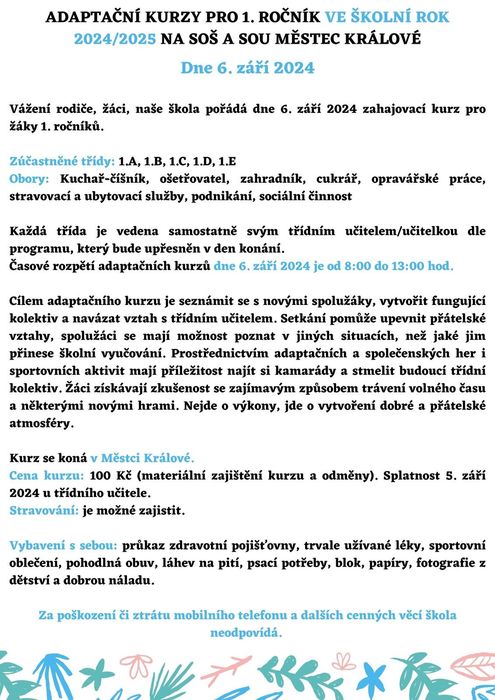 Cena kurzu: 100 Kč (materiální zajištění kurzu a odměny). Splatnost 5. září 2024 u třídního učitele.