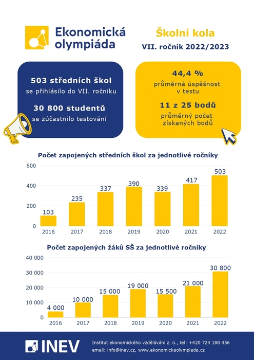 Na konci listopadu se vybraní studenti nástavbového studia podnikání rozhodli zúčastnit Ekonomické olympiády s cílem poměřit své znalosti z finanční a ekonomické gramotnosti s dalšími studenty. Je nám velkým potěšením pogratulovat k postupu do krajského kola EO slečně E. Novákové ze třídy 1.D, která dosáhla fantastické úspěšnosti 88 % správně zodpovězených otázek. Testování v krajských kolech bude probíhat písemnou formou. Až na výjimky se krajské kolo vždy koná v daném kraji na krajském úřadě nebo partnerské univerzitě. Krajská kola pro ročník 2022/23 se uskuteční na přelomu ledna a února 2023. Na základě výsledků krajských kol postoupí 50 žáků z celé České republiky do slavnostního finále konaného v reprezentativních prostorech České národní banky v Praze.