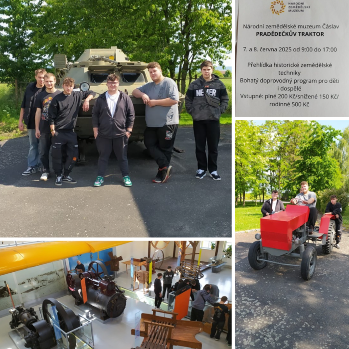 Dne 27. května 2025 proběhla exkurze žáků učebního oboru opravářské práce do Národního zemědělského muzea v Čáslavi, kde se seznámili s historií zemědělského vývoje. Velký zájem byl o pracovní stroje jako jsou traktory, kombajny, různé druhy pluhů, ale i o samotné motory a jejich různorodé uplatnění. Exkurze byla obohacena o odborný výklad mistra odborného výcviku pana J. Šafaříka.