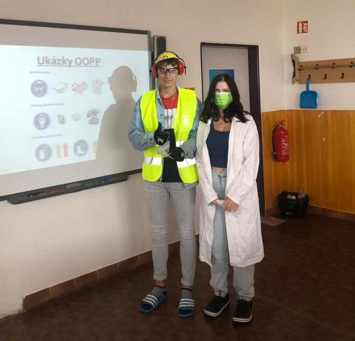Hodina výuky BOZP v předmětu Zdravotnická nauka ve třídě 1.E. Žáci oboru sociální činnost měli hodinu zaměřenou na ochranné pomůcky při práci. Na konci hodiny proběhla názorná ukázka, kdy zbytek třídy popisoval, co by Kuba (jako dělník) a Terka (jako laborant) měli mít za ochranné pomůcky a dle toho si je brali z tašek a rovnou oblékali.