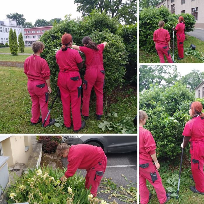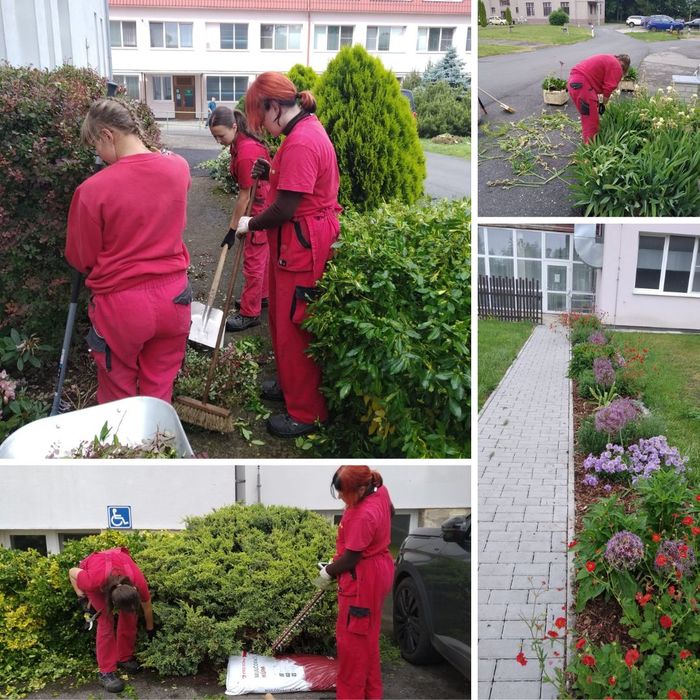 Naši žáci a žákyně učebního oboru zahradník vyrazili v rámci svého odborného výcviku do areálu Městské nemocnice v Městci Králové, kde se věnovali úpravě zeleně a prostor nemocnice. Odborný výcvik našich zahradníků a zahradnic probíhá ale i na soukromých zahradách, jak můžete vidět na fotografiích.