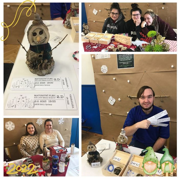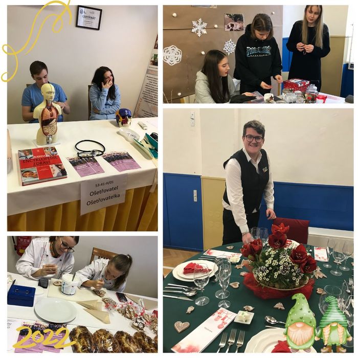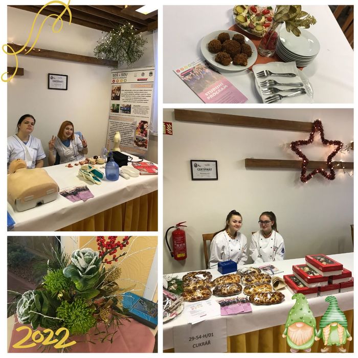 Ve dnech 13. – 15. prosince 2022 se v prostorách naší školy uskutečnily Dny otevřených dveří, které byly spojeny s vánoční prodejní výstavou. Zájemci o studium a jejich rodiče využili možnost prohlédnout si školní prostory a získat podrobné informace o studiu jednotlivých oborů vzdělání od našich učitelů i žáků. V rámci vánoční prodejní výstavy měla široká veřejnost příležitost prohlédnout si, popř. zakoupit rukodělné výrobky od našich žáků, či posedět nad dobrou kávou a zákusky ve školní kavárně. Děkujeme všem, kteří svým nákupem ručně vyráběných vánočních dekorací a ozdob přispěli na dobrovolnou finanční sbírku „Prales dětem“ od organizace NEPZ, kterou pořádají žákyně nástavbového studia obor sociální činnost.