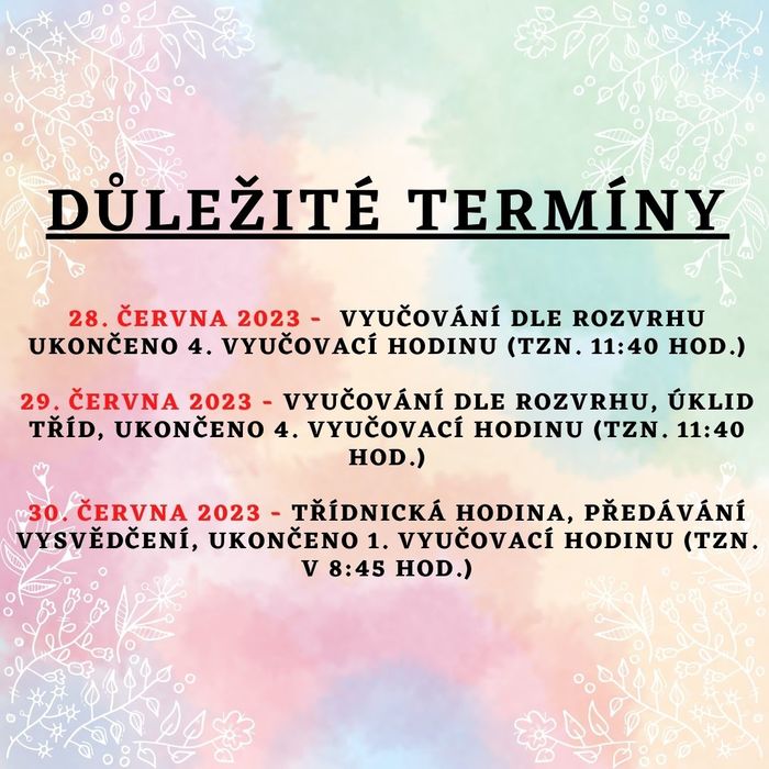 30. června 2023 - třídnická hodina, předávání vysvědčení, ukončeno 1. vyučovací hodinu (tj. v 8:45 hod.)