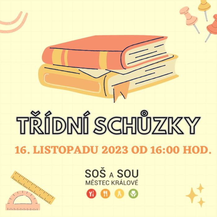 Ve čtvrtek dne 16. listopadu 2023 bude výuka na SOŠ a SOU v Městci Králové ukončena 6. vyučovací hodinu (tzn. ve 13:50 hod.) z důvodů konání schůze pedagogické rady za I. čtvrtletí školního roku 2023/24. Zároveň si dovolujeme pozvat rodiče na třídní schůzky konané rovněž dne 16. listopadu 2023 od 16:00 hod. Třídní schůzky se uskuteční v učebnách jednotlivých tříd dle rozpisu (bude v dostatečném předstihu zveřejněno). V pátek dne 17. listopadu 2023 bude státní svátek. Vyučování na SOŠ a SOU Městec Králové začne opět v pondělí 20. listopadu 2023 podle rozvrhu lichého kalendářního týdne.