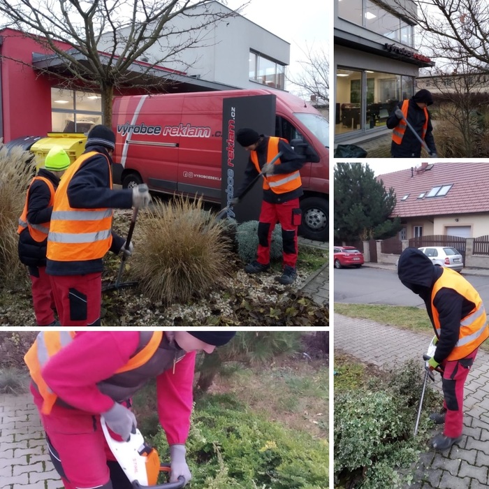Zahradníci při údržbě zelené ve firmě Reklamní studio Kořínek Nymburk.