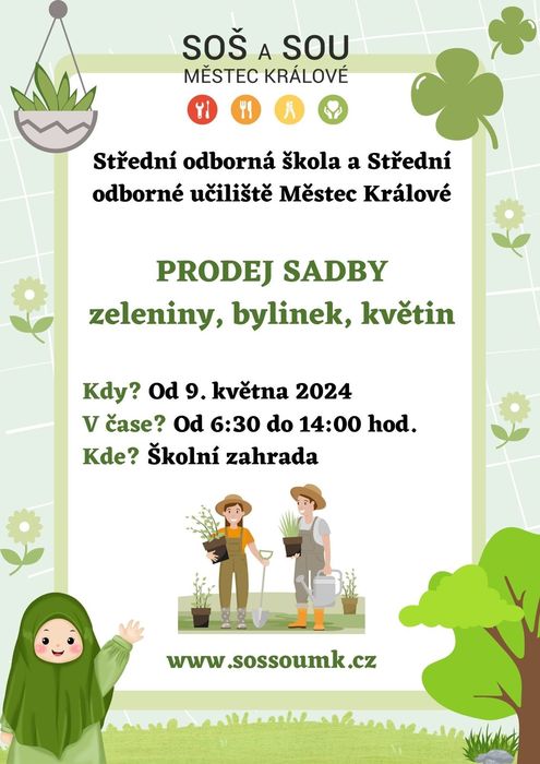 Střední odborná škola a Střední odborné učiliště Městec Králové oznamuje, že od 9. května 2024 v čase od 6:30 do 14 hod. bude probíhat ve škola zahradě (u vlakového nádraží) prodej sadby zeleniny, bylinek a květin. Těšíme se na Vás!