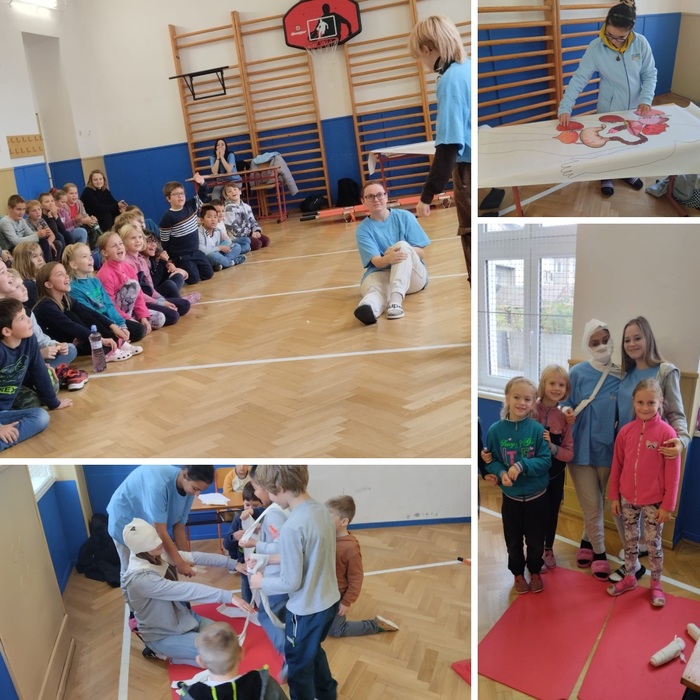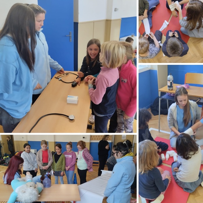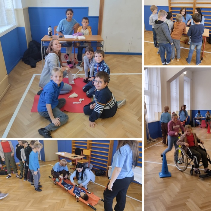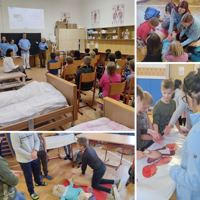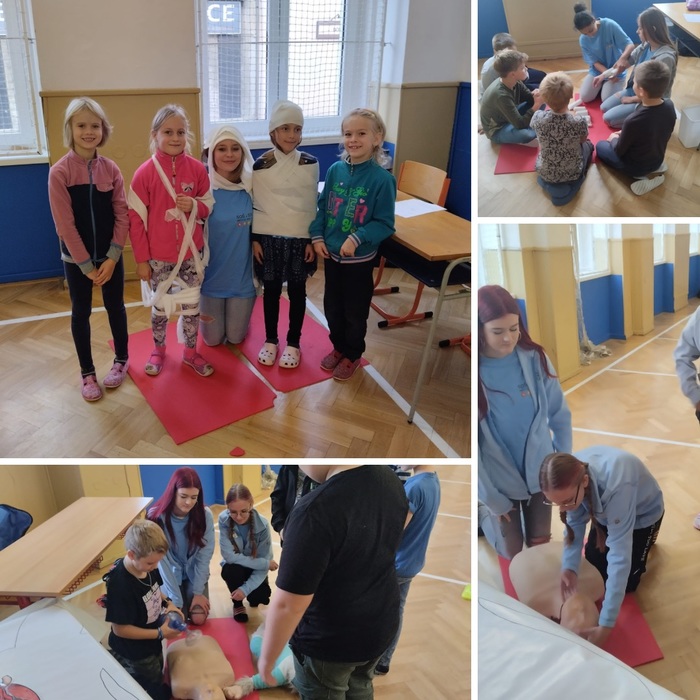 Naši žáci třídy 1.A obor ošetřovatel prováděli dnes přednášku první pomoci dětem ze ZŠ Budiměřice.