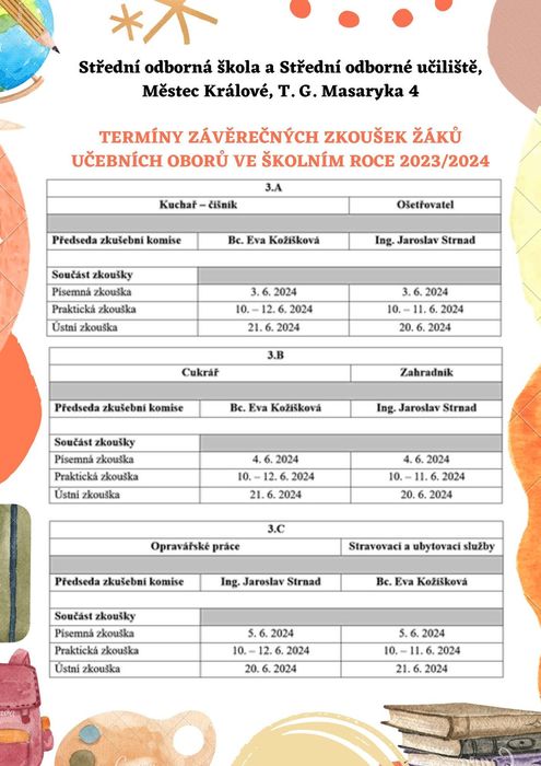 SOŠ a SOU Městec Králové ustanovuje termíny závěrečných zkoušek žáků učebních oborů ve školním roce 2023/2024. Přejeme našim žákům pevné nervy a hlavně hodně štěstí u závěrečných zkoušek!
