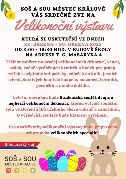 SOŠ a SOU Městec Králové Vás srdečně zve na Velikonoční výstavu, která se uskuteční ve dnech 28. - 30. března 2023 v čase od 8:00 do 16:30 hod. v hlavní budově školy na adrese T. G. Masaryka 4.