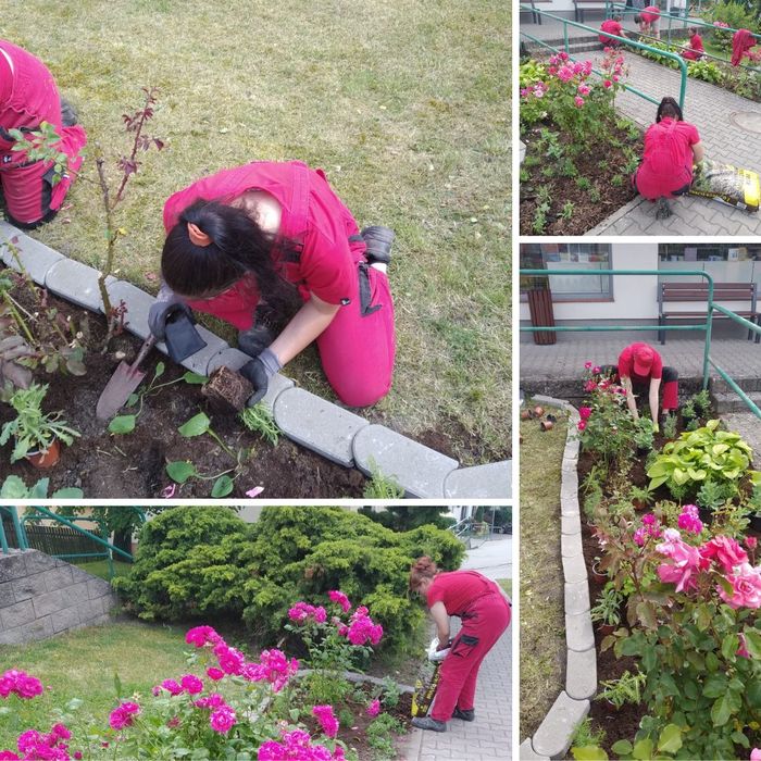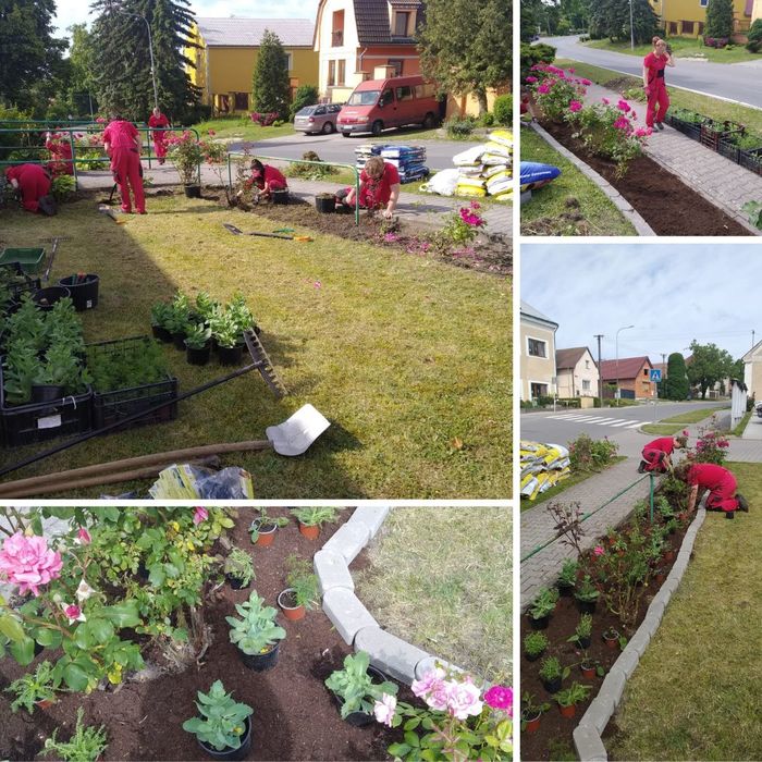 Zahradníci a zahradnice z 1. ročníku při výsadbě 300 trvalek v obci Opočnice.
