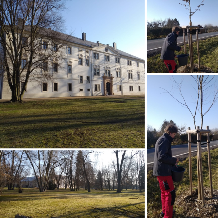 Zahradníci pracují v Křinci, kde přihnojují nové výsadby stromů a keřů.